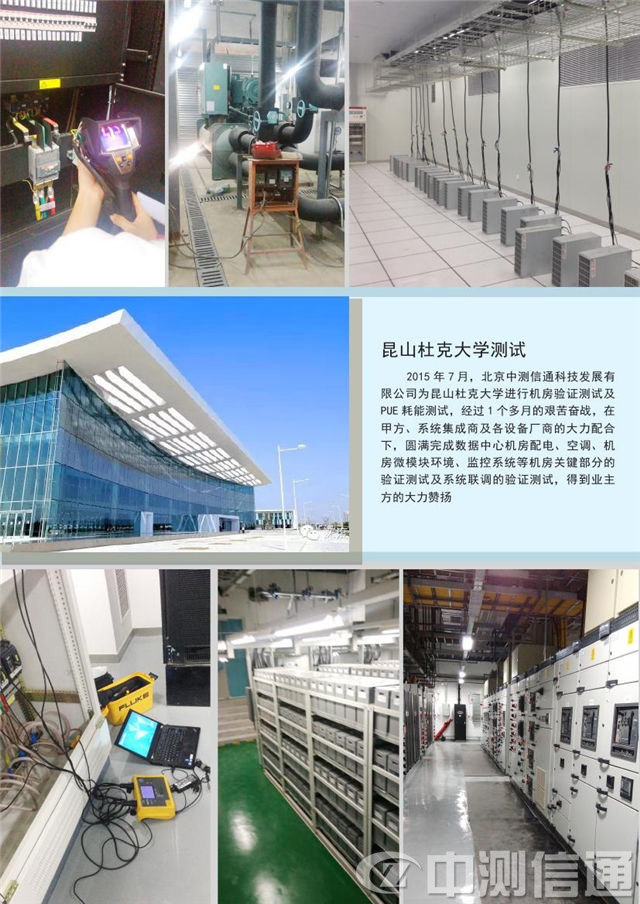 2015年7月,北京中測信通科技發(fā)展有限公司為昆山杜克大學(xué)案例進(jìn)行機(jī)房驗(yàn)證測試及PUE耗能測試,經(jīng)過艱苦奮戰(zhàn),在甲方、系統(tǒng)集成商及各設(shè)備廠商的大力配合下,圓滿完成數(shù)據(jù)中心機(jī)房配電、空調(diào)、機(jī)房微模塊環(huán)境、監(jiān)控系統(tǒng)等機(jī)房關(guān)鍵部分的驗(yàn)證測試及系統(tǒng)聯(lián)調(diào)的驗(yàn)證測試,得到業(yè)主方的大力贊揚(yáng).
