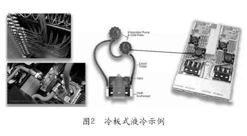 、倮浒迨揭豪:主要發(fā)熱器件固定在冷板上,依靠流經(jīng)冷板的液體將熱量帶走達到散熱的目的,是典型的間接接觸型液冷,由于硬盤,電源等其它發(fā)熱部件依然需要風扇驅(qū)動空氣來散熱,因此目前采用冷板式液冷的服務器也稱為氣液雙通道服務器。冷板式液冷技術經(jīng)過幾年的發(fā)展相對成熟,在近兩年的開放數(shù)據(jù)中心峰會上,BAT等互聯(lián)網(wǎng)巨頭分別展示了其冷板式液冷服務器,并且,冷板式液冷服務器對于目前的數(shù)據(jù)中心的架構影響不大,具有低噪音,高能效以及低總體擁有成本的特點,可解決較高熱密度的數(shù)據(jù)中心的散熱問題。圖2為冷板式液冷示例。