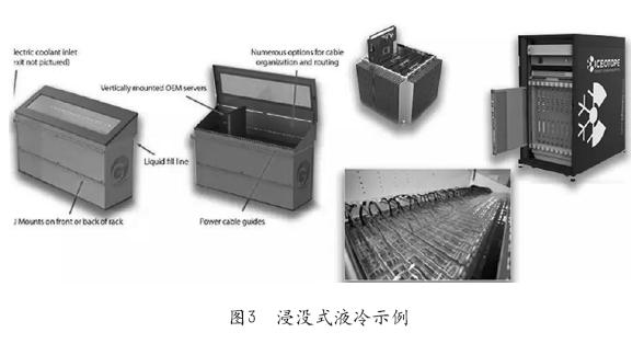 、诮䴖]式液冷:顧名思義是將發(fā)熱元件浸沒在冷卻液中,依靠液體的流動循環(huán)帶走IT設備運行產(chǎn)生的熱量。浸沒式液冷是典型的直接接觸型液冷,目前比較流行的方式是將服務器浸沒在特殊設計的箱體中,但是這一架構降低了數(shù)據(jù)中心建筑空間利用率,也有部分廠商為服務器定制設計了一個外殼,外殼將每一個服務器和冷卻液包裹起來,在不改變現(xiàn)有數(shù)據(jù)中心部署架構的前提下,優(yōu)化了空間利用率。浸沒式液冷由于發(fā)熱元件與冷卻液直接接觸,散熱效率更高,相對于冷板式液冷,噪音更低(完全沒有風扇),解決更高熱密度和更加節(jié)能。圖3為浸沒式液冷示例。