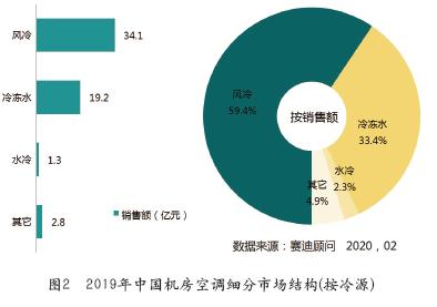 按照制冷冷源不同,機(jī)房空調(diào)可以分為風(fēng)冷型、水冷型和冷凍水型。隨著數(shù)據(jù)中心綠色節(jié)能、高密度、超大規(guī)模的發(fā)展趨勢(shì),特別是大型互聯(lián)網(wǎng)企業(yè)的新建數(shù)據(jù)中心,傳統(tǒng)風(fēng)冷型制冷技術(shù)已經(jīng)無法滿足所需的散熱能力,冷凍水型制冷系統(tǒng)在高效制冷和大制冷量方面的優(yōu)勢(shì),推動(dòng)了其較快推廣。據(jù)賽迪顧問統(tǒng)計(jì),從市場(chǎng)需求和銷售額來看,風(fēng)冷型制冷仍是目前機(jī)房空調(diào)中的主流機(jī)型,但冷凍水型制冷呈現(xiàn)較快增長趨勢(shì)。2019年,風(fēng)冷型機(jī)房空調(diào)市場(chǎng)銷售額達(dá)34.1億元,市場(chǎng)占有率為59.4%;冷凍水型機(jī)房空調(diào)市場(chǎng)銷售額達(dá)19.2億元,市場(chǎng)占有率為33.4%,見圖2。