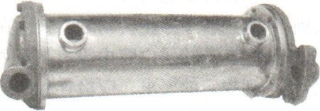 水冷式潤滑油冷卻裝置的實(shí)物外形及零件分解如圖6-36和圖6-37所示。它主要由芯子和殼體組成。芯子由黃銅管、散熱片和隔片組成。潤滑油在芯子與殼體的夾層之間流動。冷卻液在芯子內(nèi)部流動時,帶走潤滑油的部分熱量。經(jīng)過冷卻液的循環(huán)往復(fù)流動,使油溫控制在80·C±5·C范圍內(nèi)。