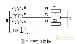 1.2 三相不平衡且中性線斷線、未接好或阻抗較大導(dǎo)致中性點(diǎn)位移