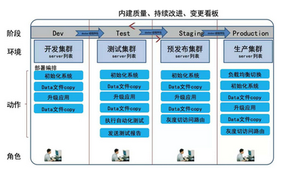 從應用的角度,資源的信息都能夠很好的維護起來。此時就考慮如何支撐應用的動作了。這個場景起來之后,真正能解決CMDB數據維護動力和價值問題。面向應用的視角,提供完整的應用自動化和運維自動化能力。應用自動化打通Dev/Test/Staging/Prod等環(huán)境,構建面向用戶的端到端自動化能力。典型的場景就是交付流水線,示意圖如下: