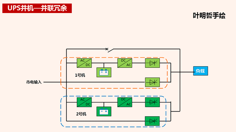 正常情況下主機(jī)帶載,從機(jī)空載,負(fù)荷不均分;主從機(jī)之間互換較困難,從機(jī)電池長(zhǎng)期空載,設(shè)備老化不一致;從機(jī)需要有帶階躍性負(fù)載的能力,否則會(huì)出現(xiàn)主機(jī)切從機(jī),從機(jī)切旁路情況;該方法目前基本不再使用。